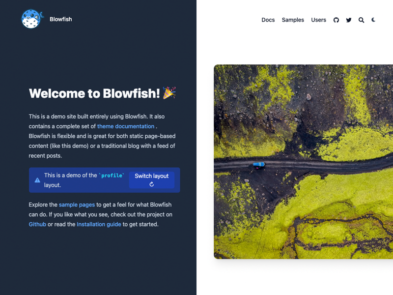Blowfish は完全に柔軟なホームページレイアウトを提供します。2つのメインテンプレートから選択でき、追加設定でデザインを調整できます。または、独自のテンプレートを提供して、ホームページのコンテンツを完全に制御することもできます。