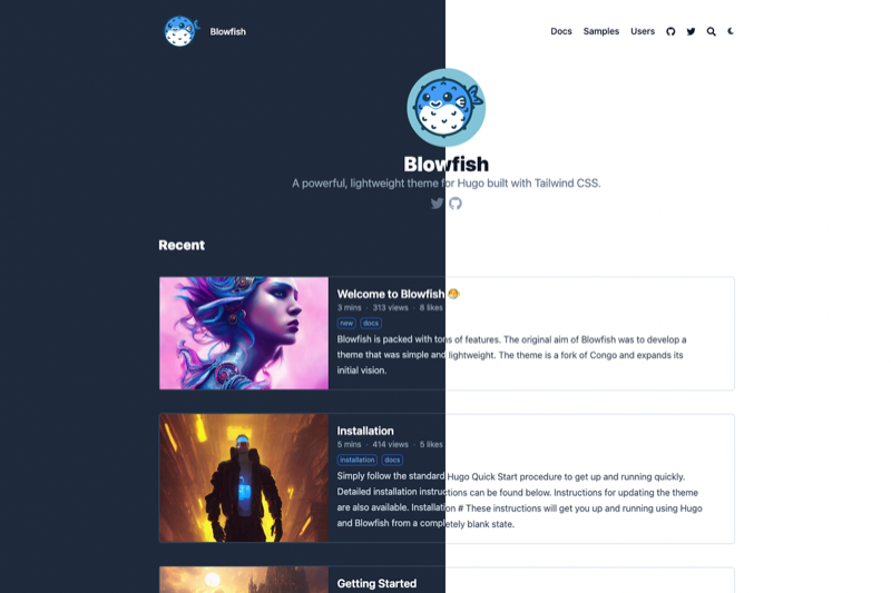 Blowfish は、記事の標準リストをカードギャラリーとして表示することもサポートしています。これは、ホームページの最新セクションとサイト全体の記事リストの両方で設定できます。ホームページの場合は homepage.cardView と homepage.cardViewScreenWidth を使用し、リストの場合は list.cardView と list.cardViewScreenWidth を使用します。詳細については、設定ドキュメントを確認し、ライブデモについてはホームページを確認してください。