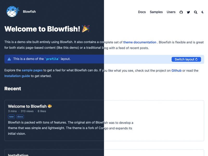 例として、このサイトのホームページでは、カスタムレイアウトを使用して、プロフィールレイアウトとページレイアウトを切り替えています。動作を確認するには、GitHub リポジトリにアクセスしてください。
